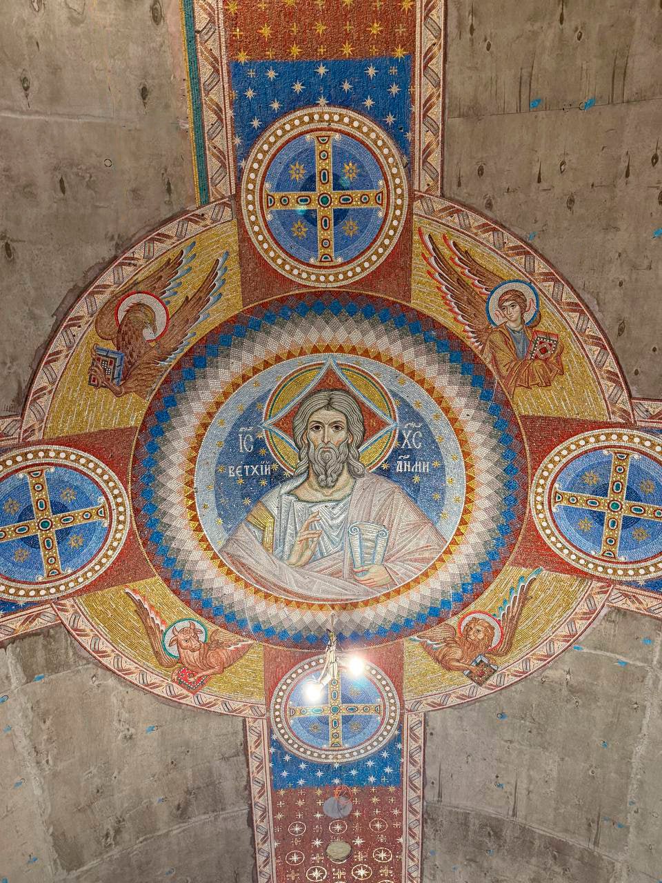 В приделе святителя Спиридона Тримифунтского смонтирован мозаичный образ "Ветхий денми" - символический образ Бога, раскрывающий такое Его сущностное свойство как «вечность».